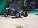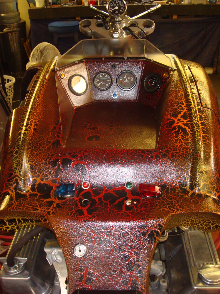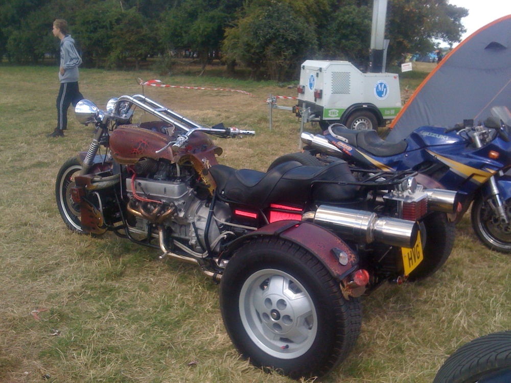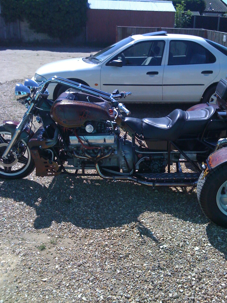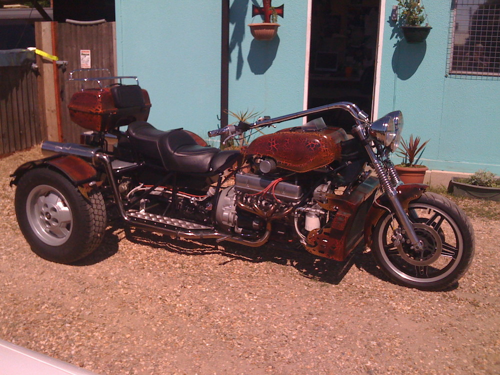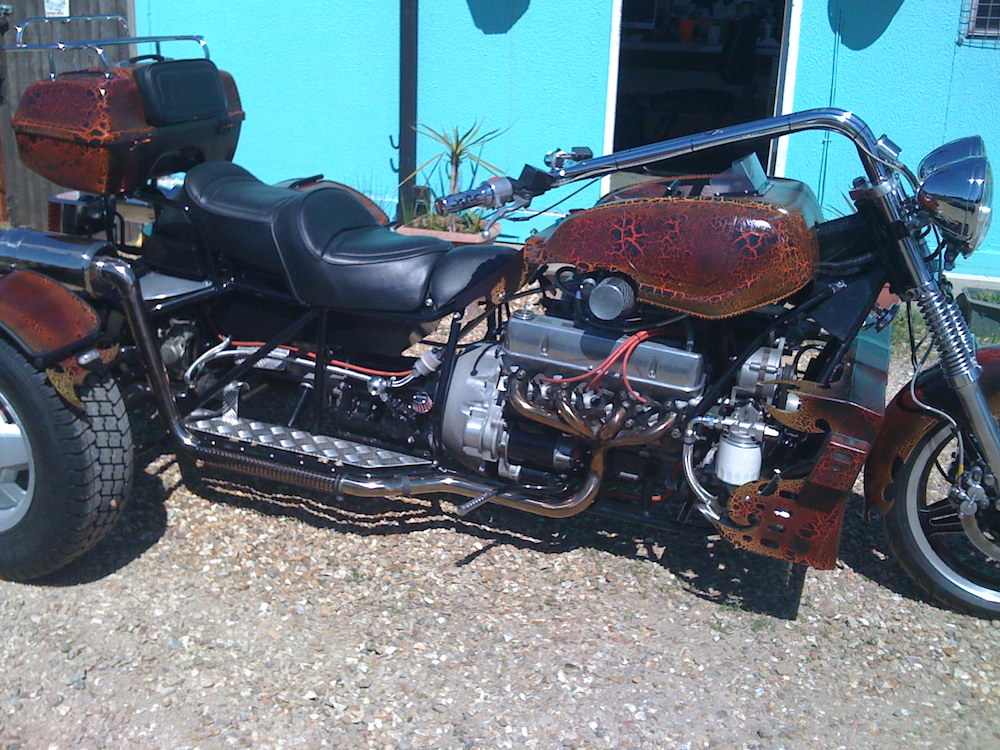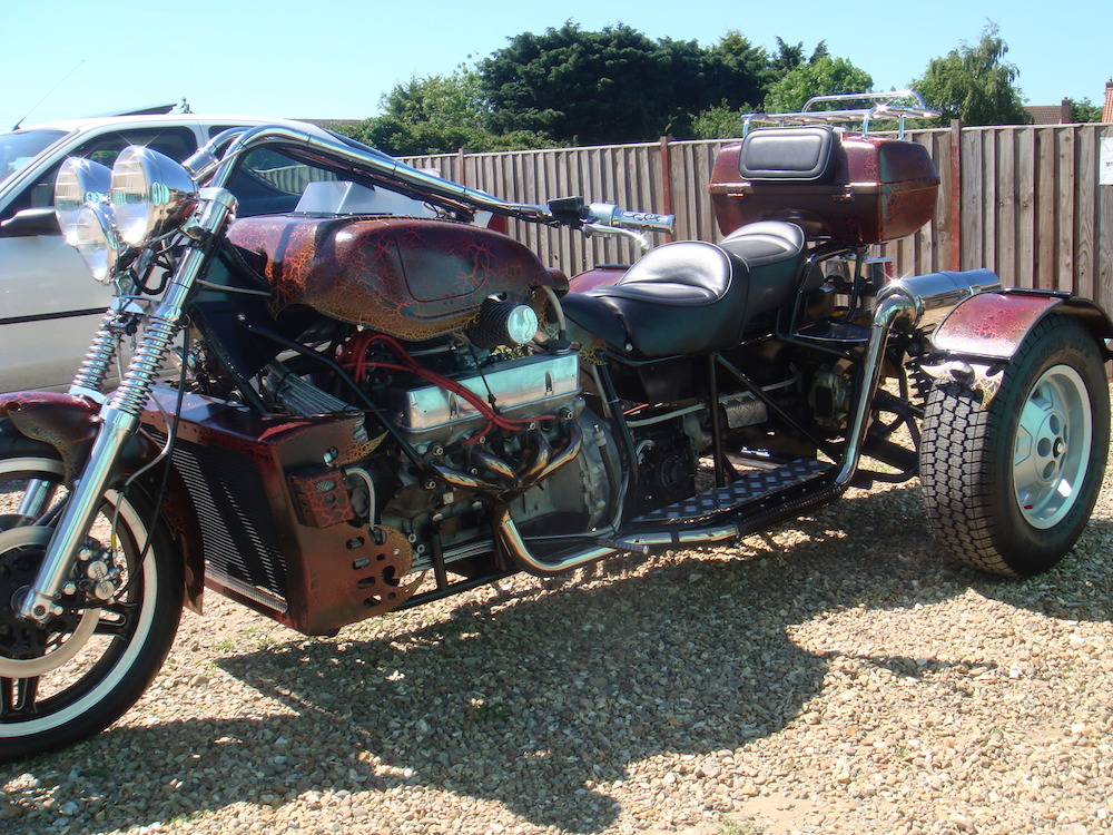 This V8 monster has a 3500 CC SD 1 rover engine, auto transmission, shortened Jag inboard disc rear end, uprated front forks, custom made frame,custom made fuel tank, custom made dummy tank fitted out with gauges and electrics, custom exhausts.custom made rad and modified goldwing seat and top box.
